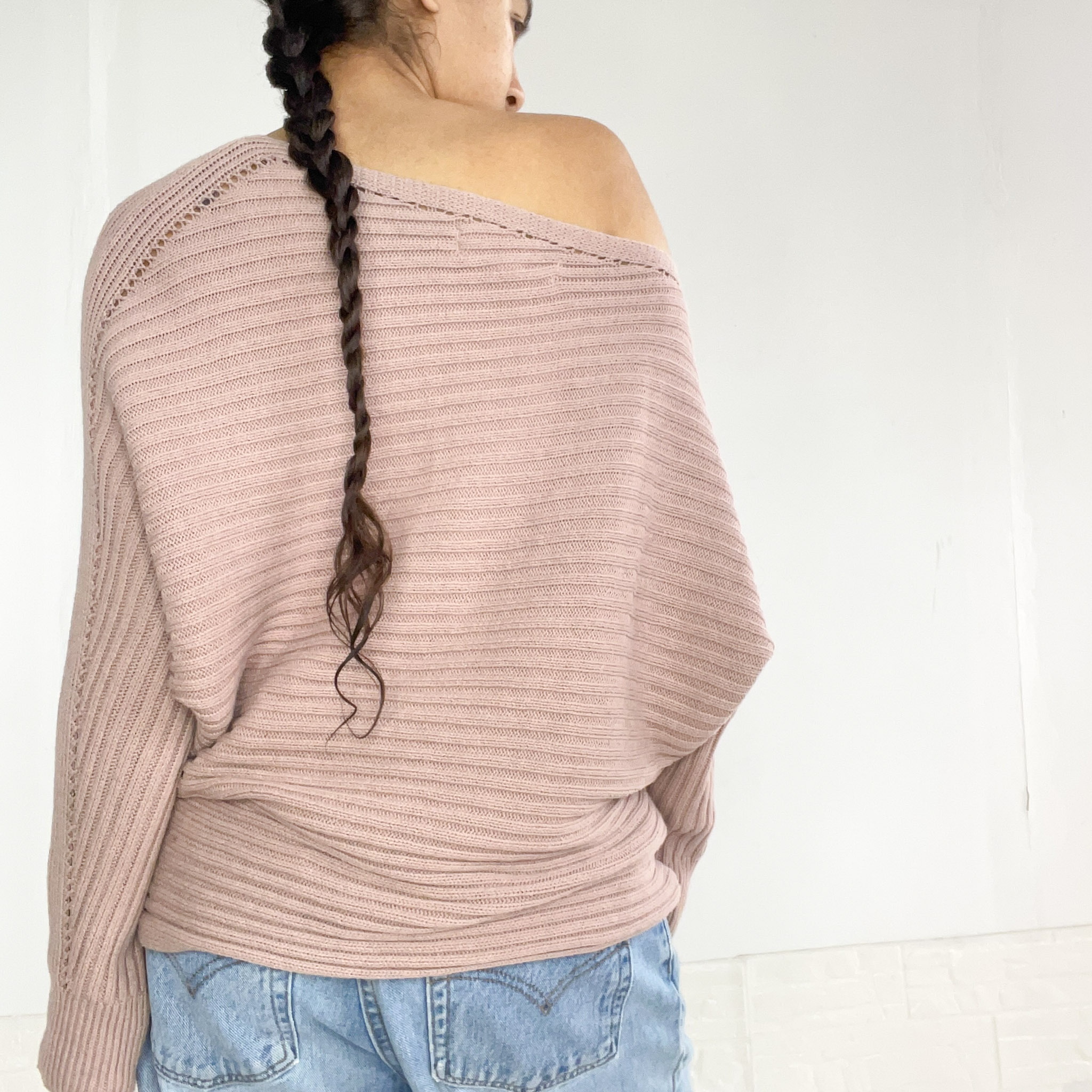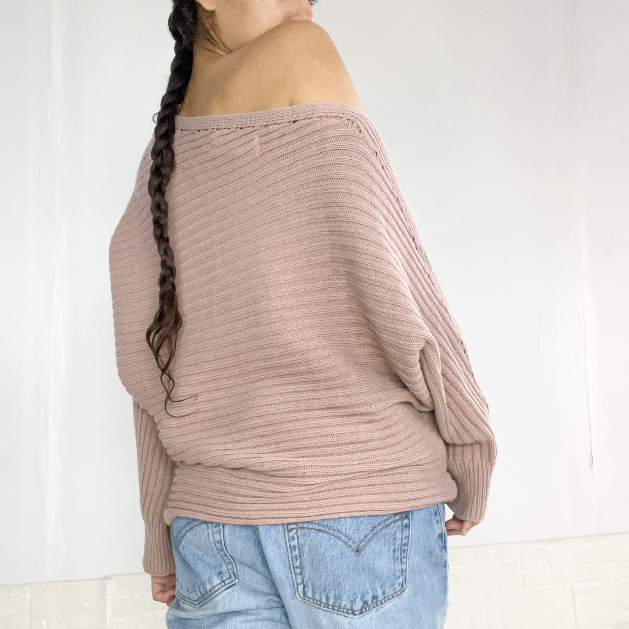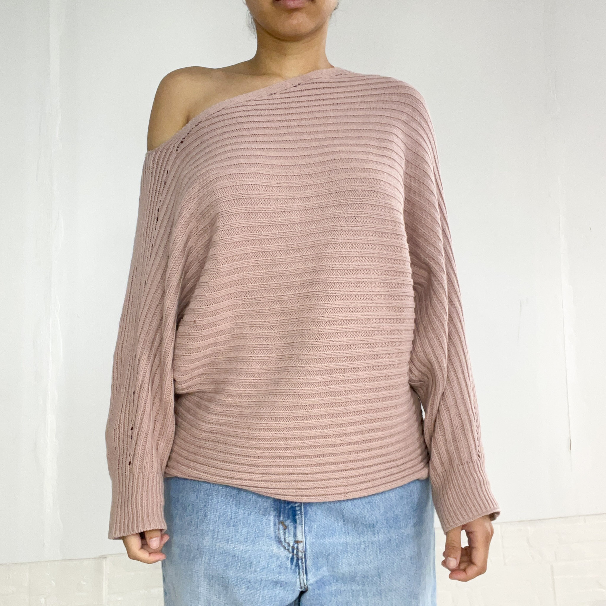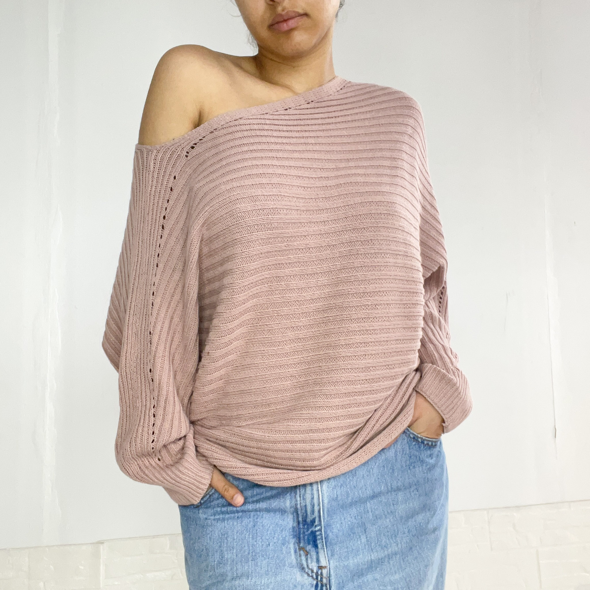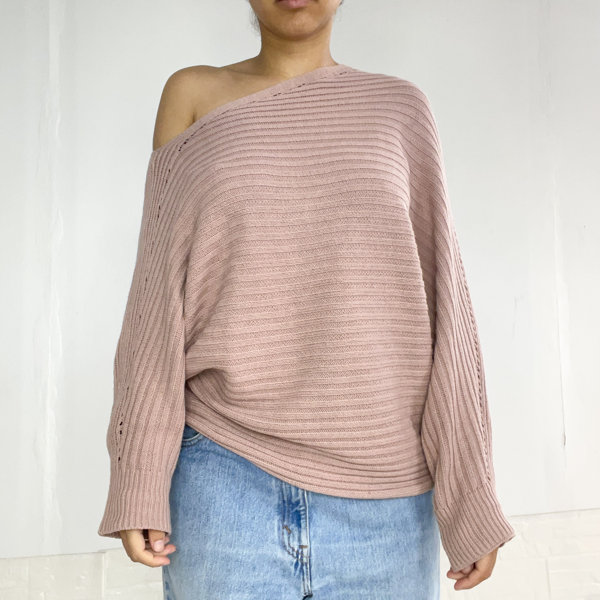 Buzo tejido asimétrico con un hombro descubierto, en color rosa viejo