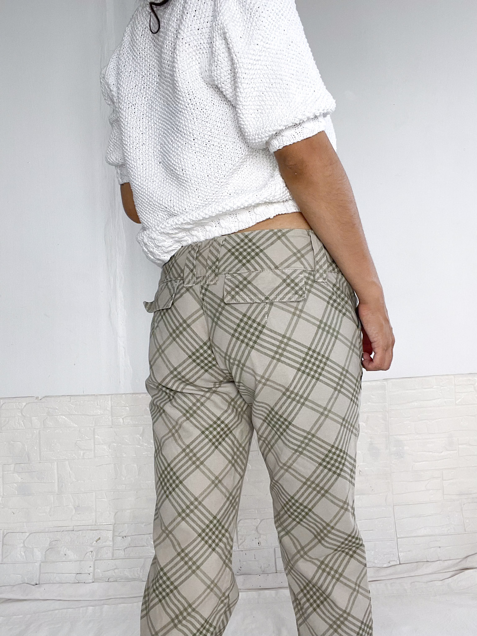 Pantalón tiro bajo en color verde con estampado estilo acuadrillé