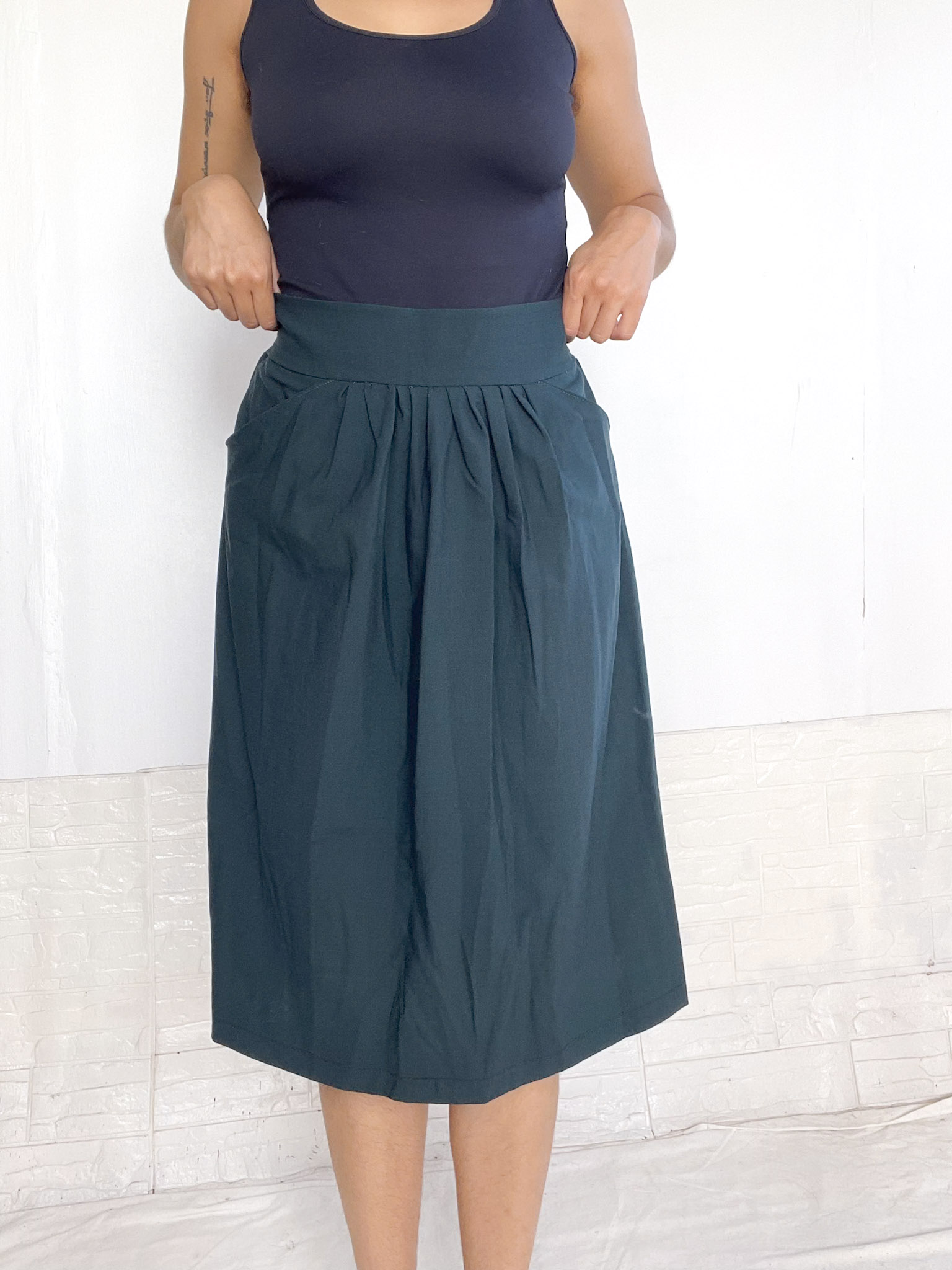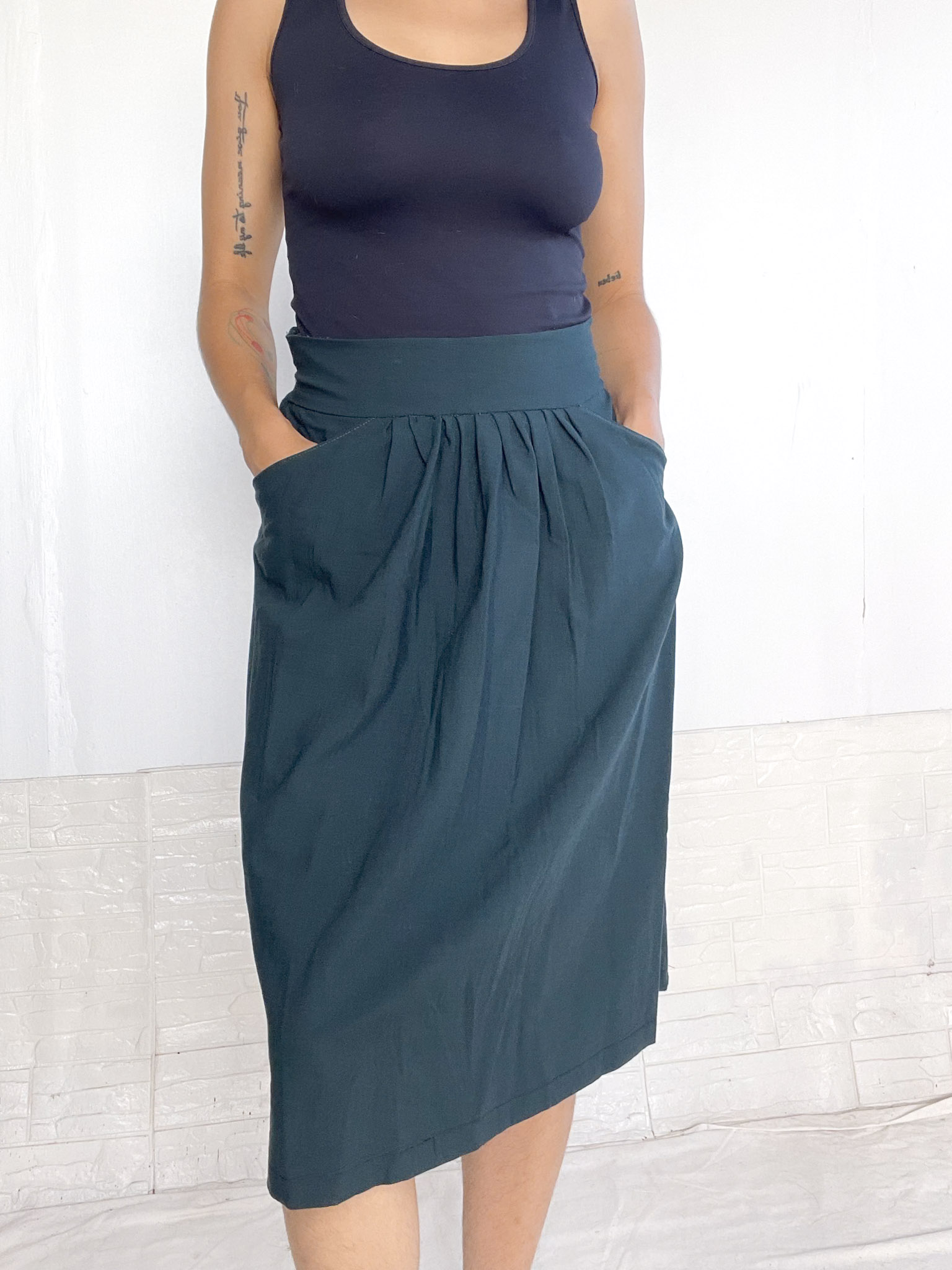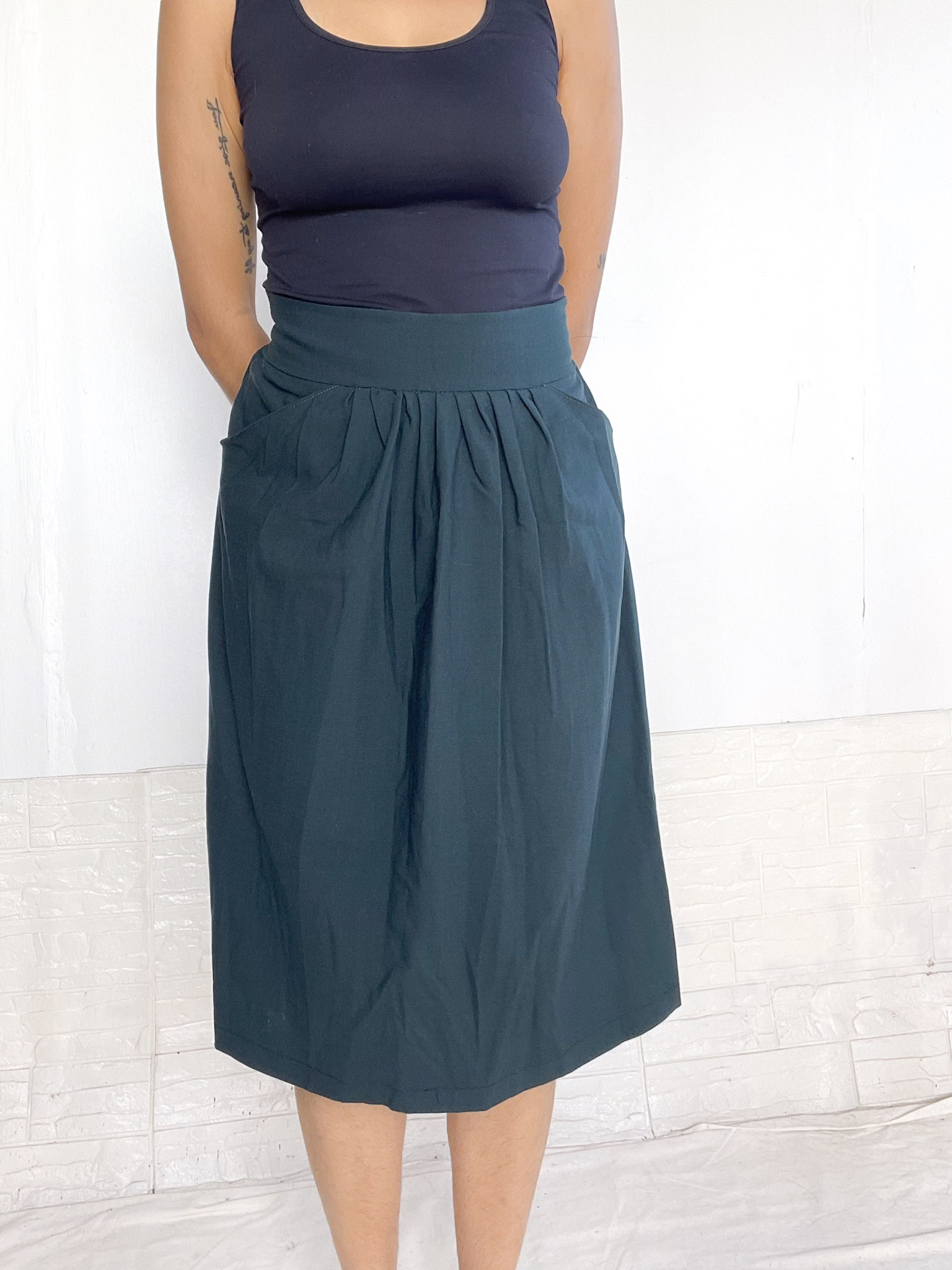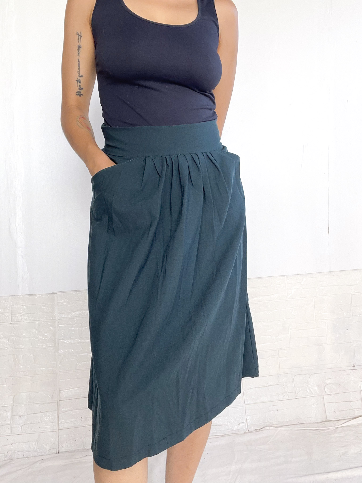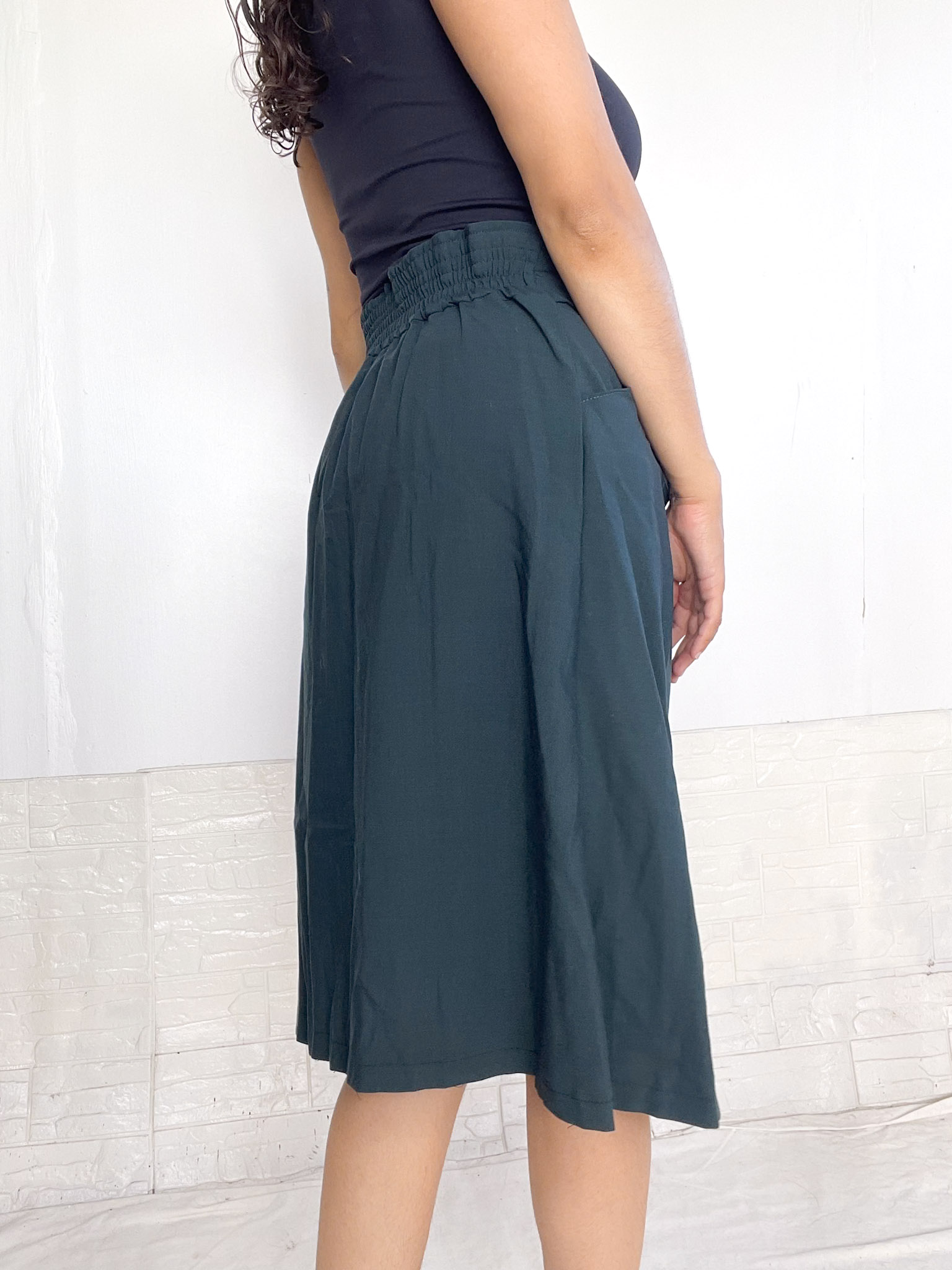 Pollera midi en color verde, con elástico en cintura y bolsillos