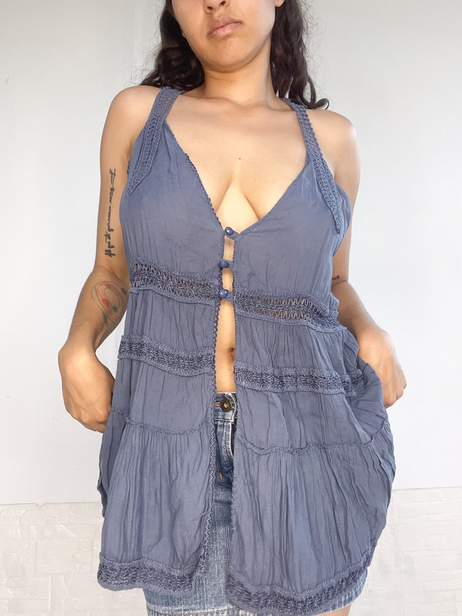 Top prendido al frente en color azul, es mega fluido