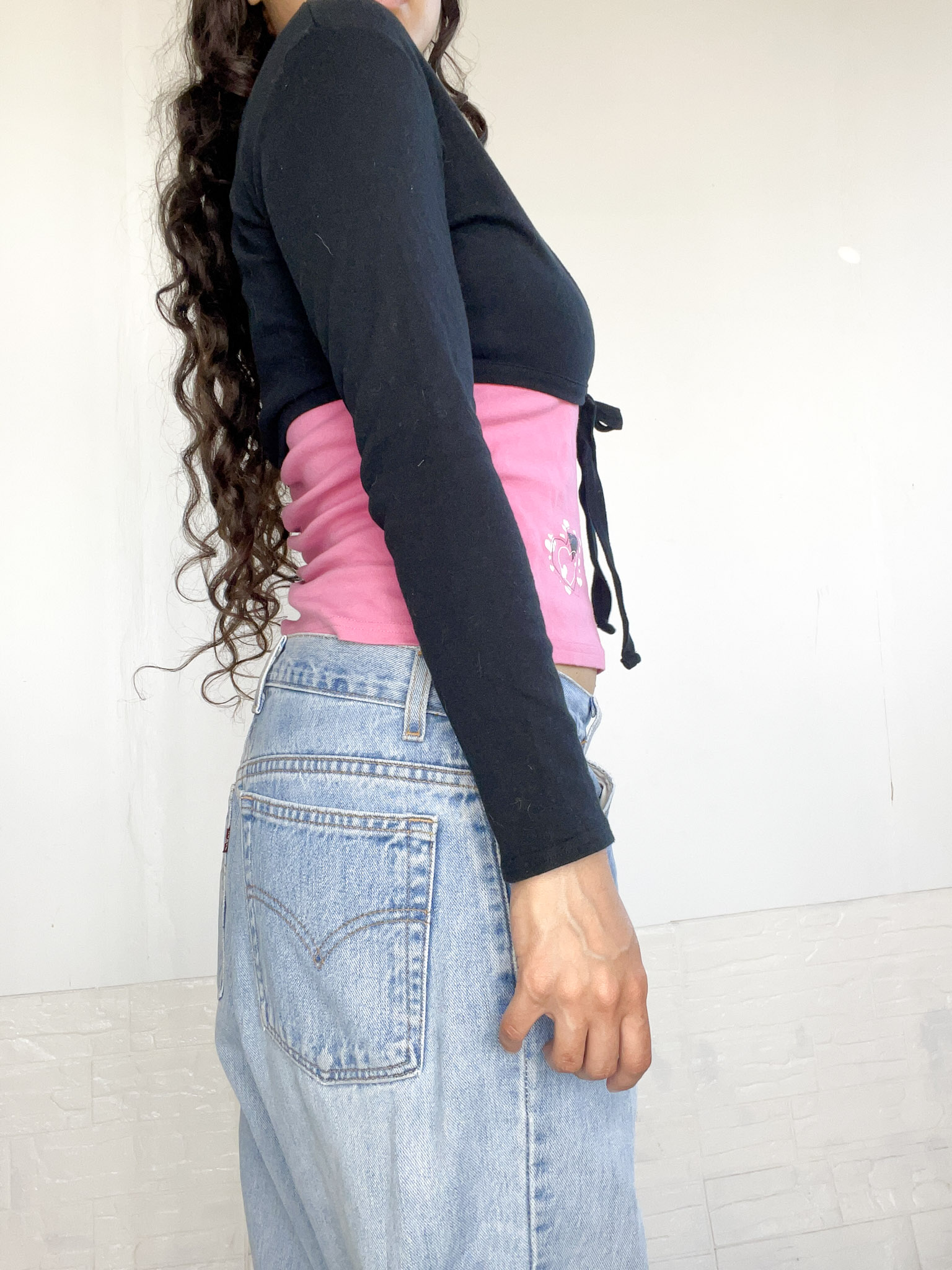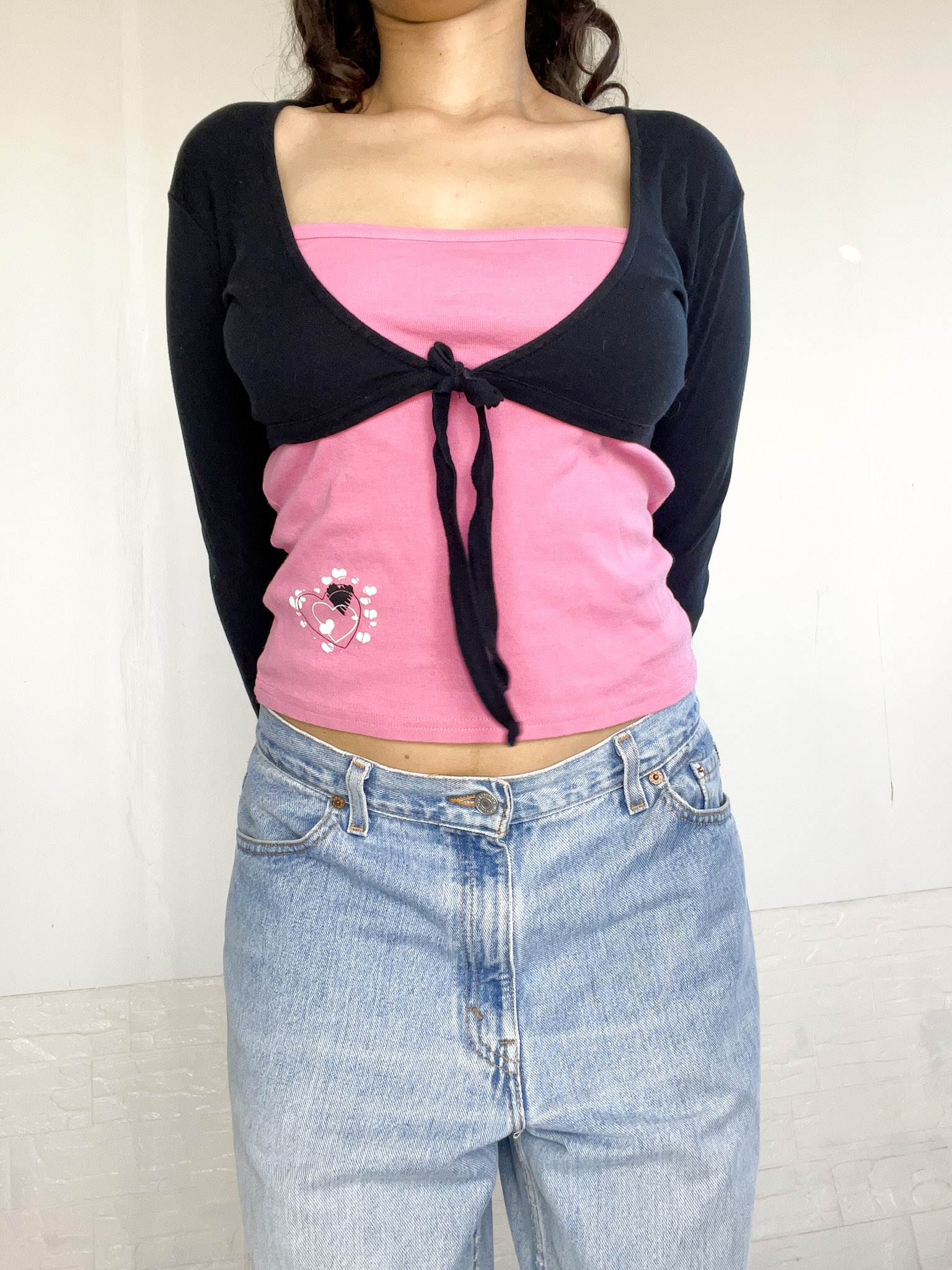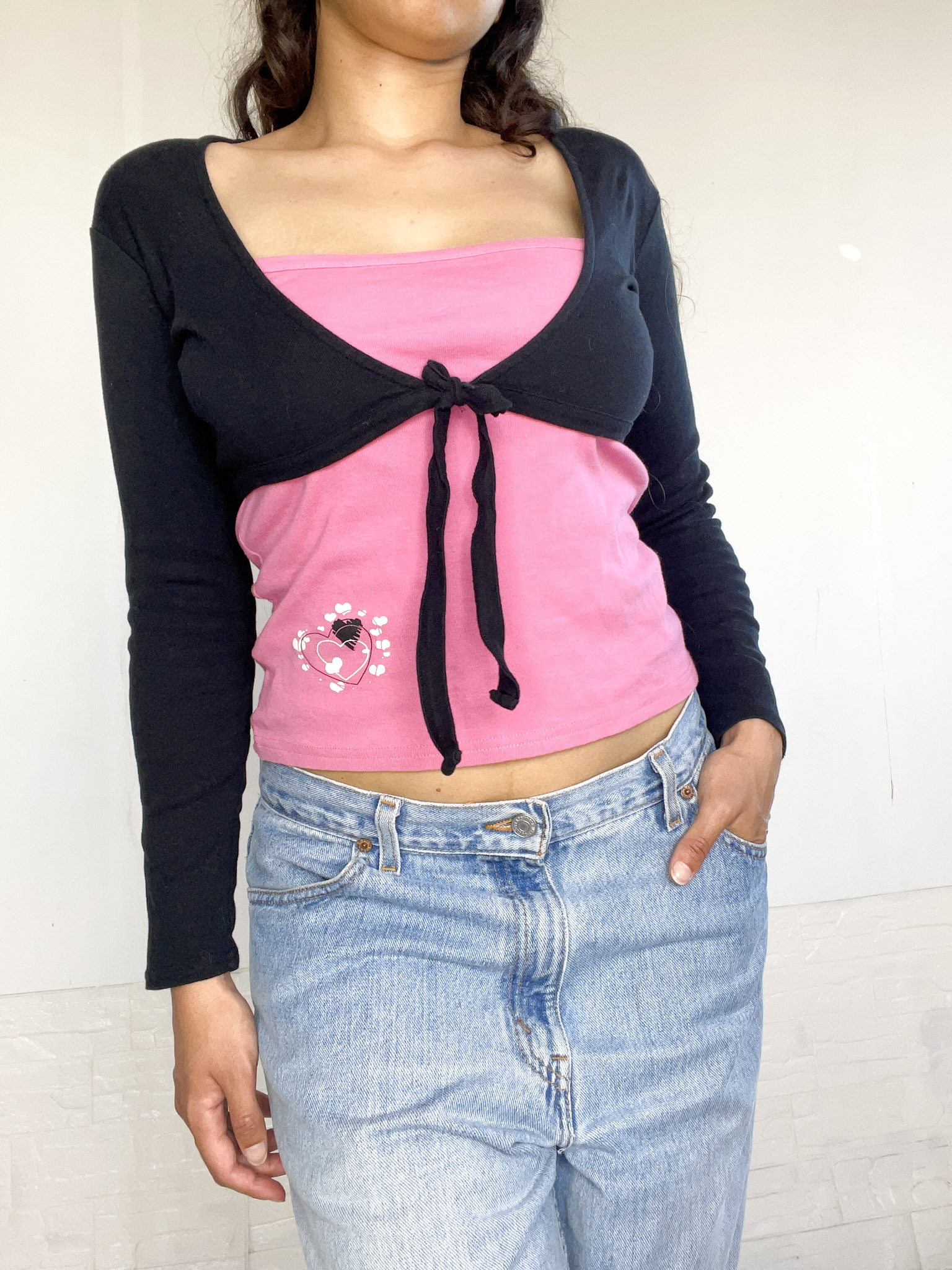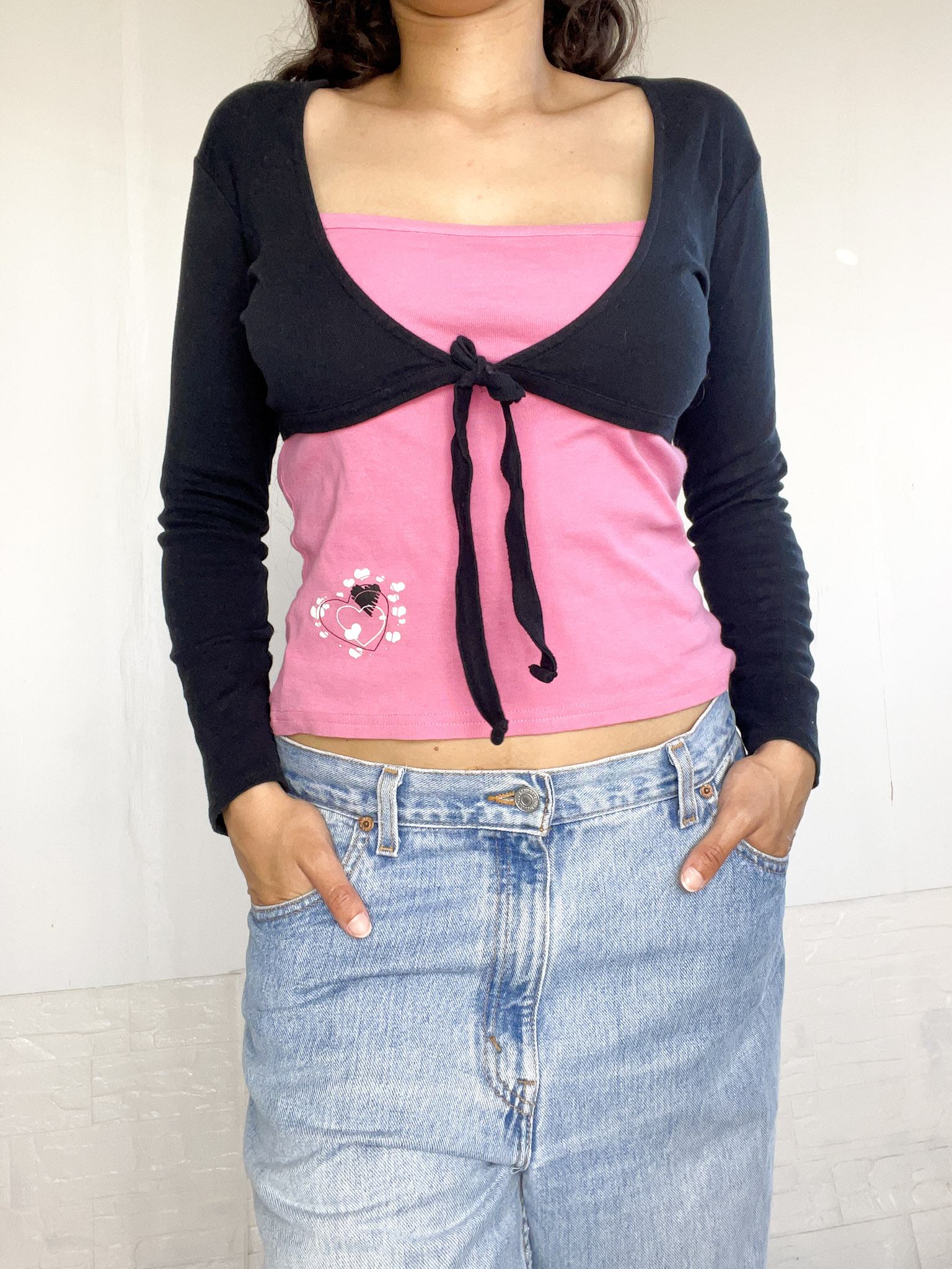 Top rosado con manguitas incluidas en color negro (es una única pieza cocida)