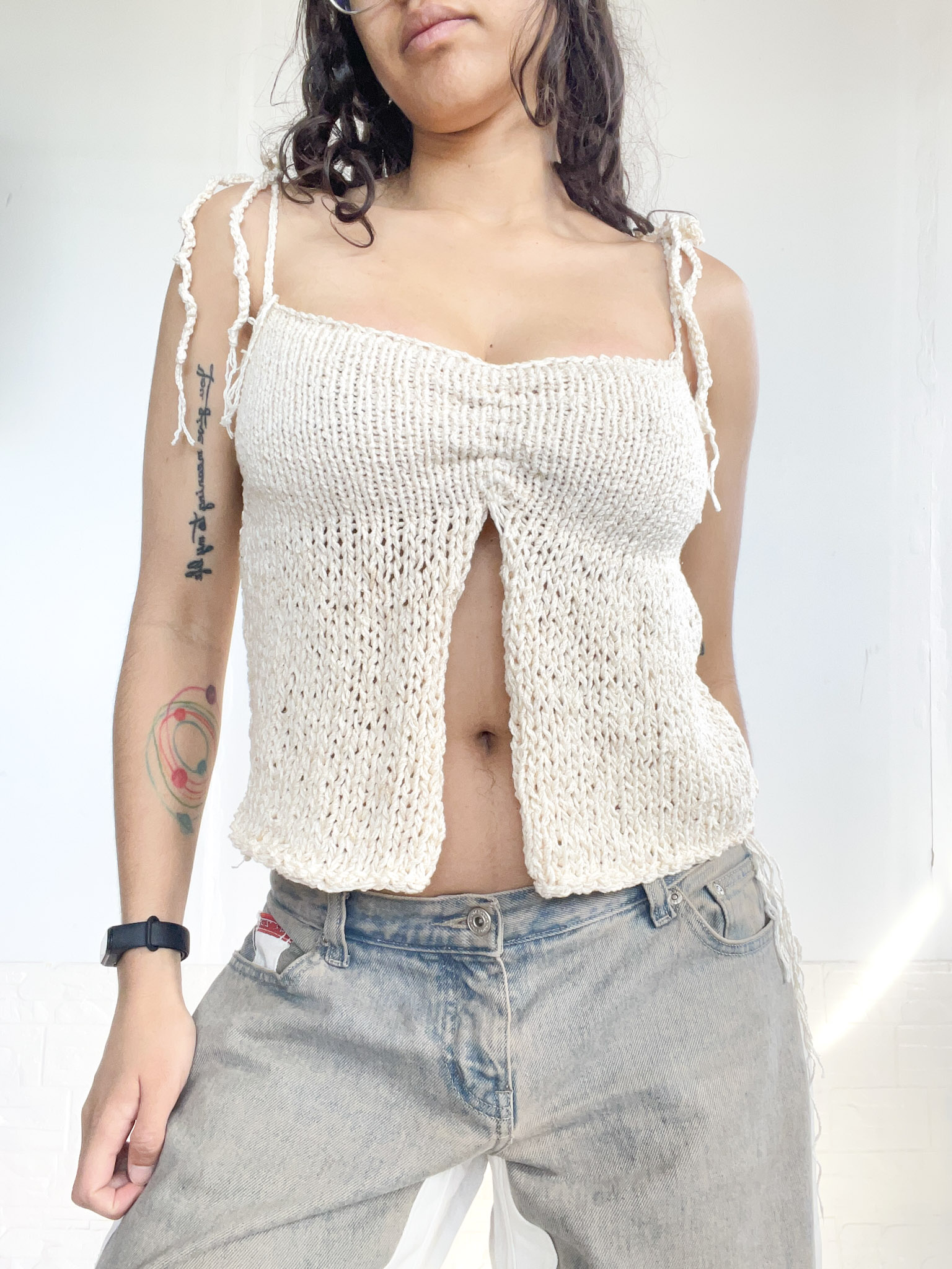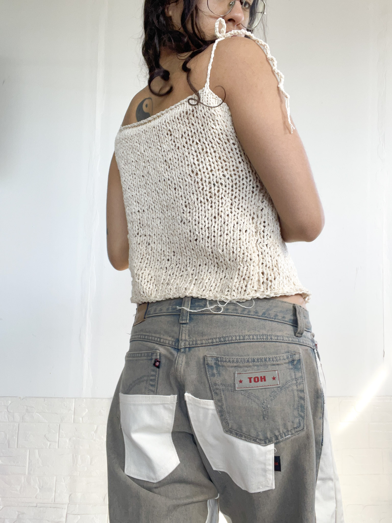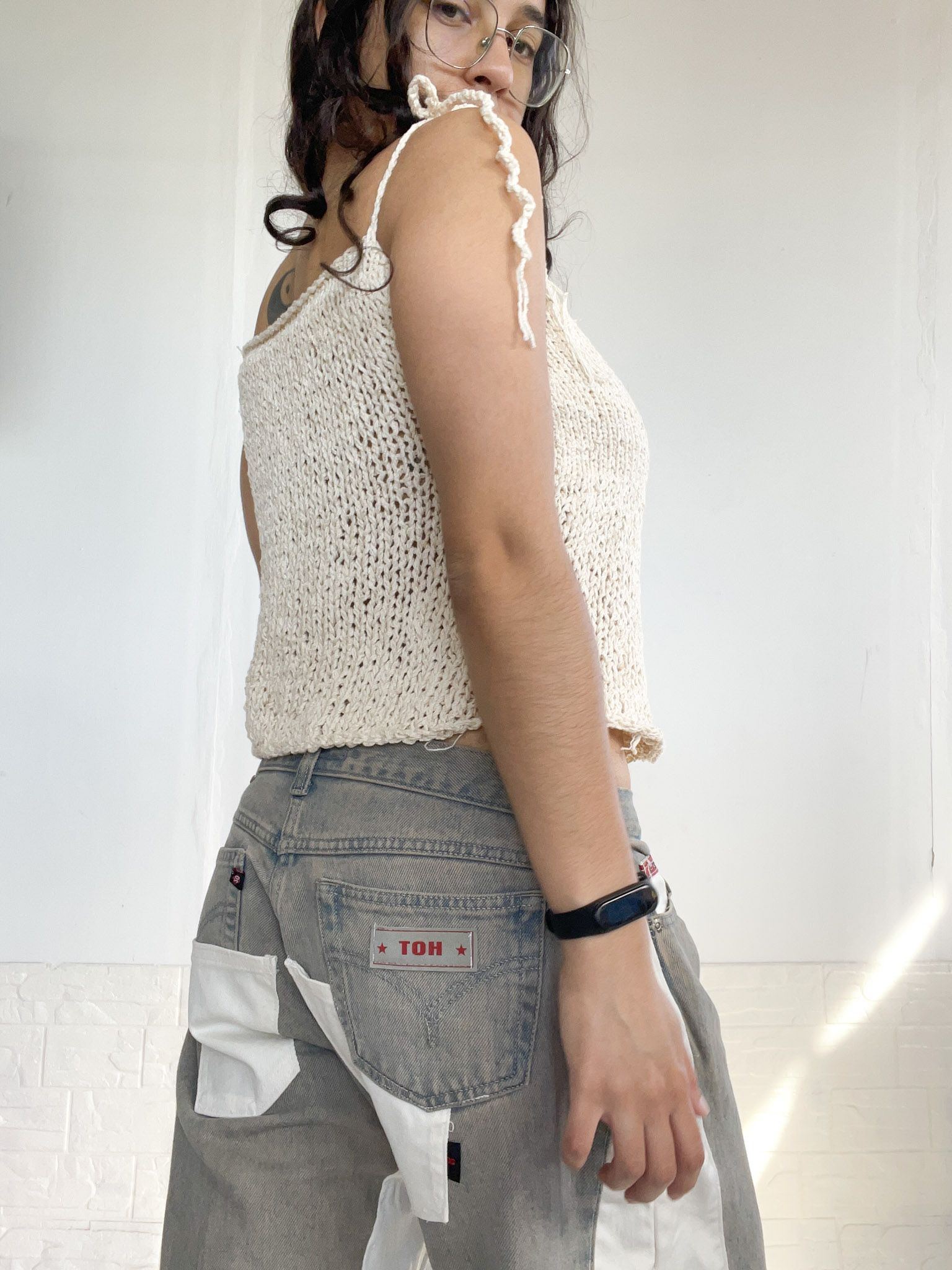 este top esta tejido con fibra reciclada de una prendita de segunda mano
