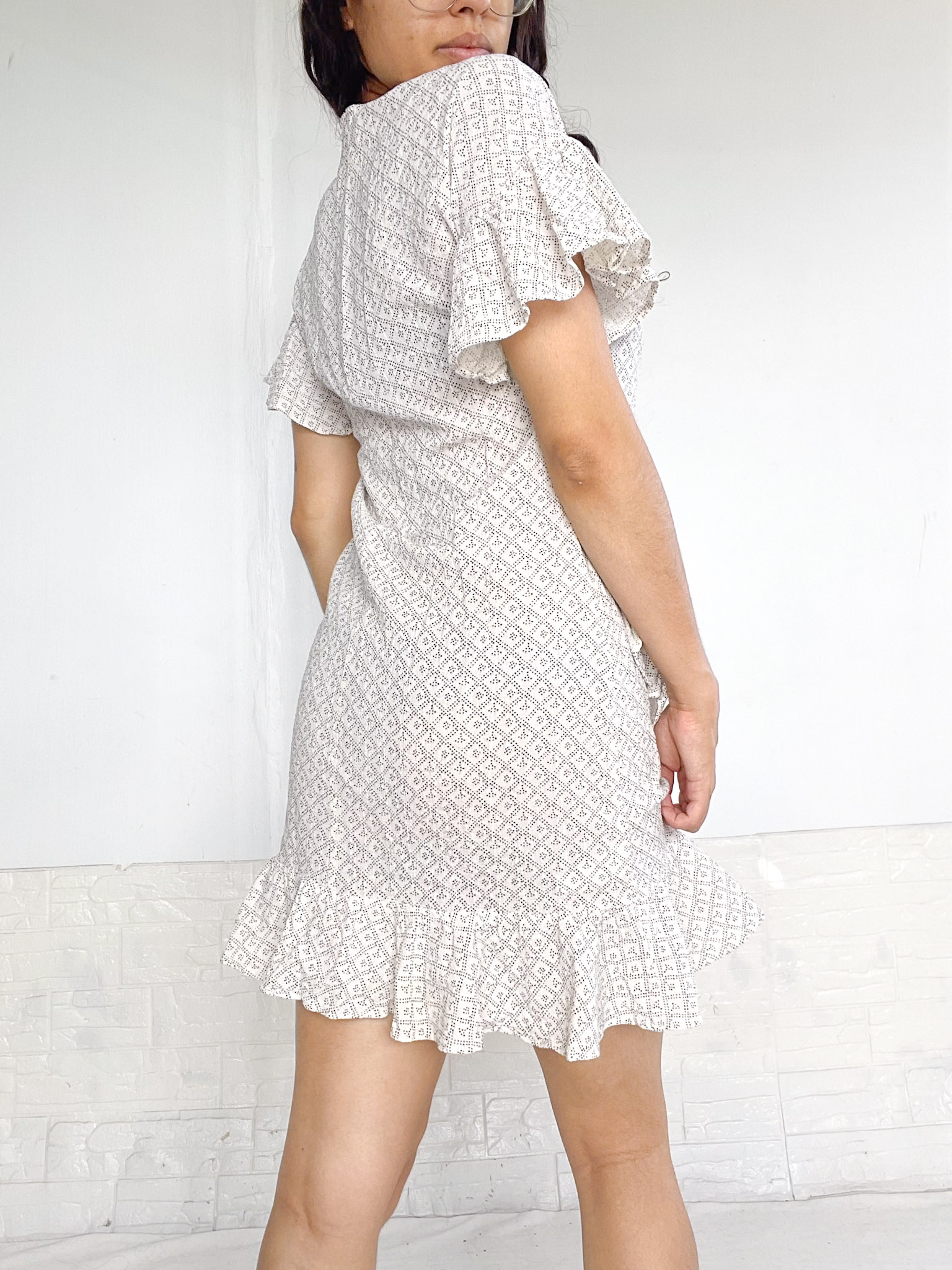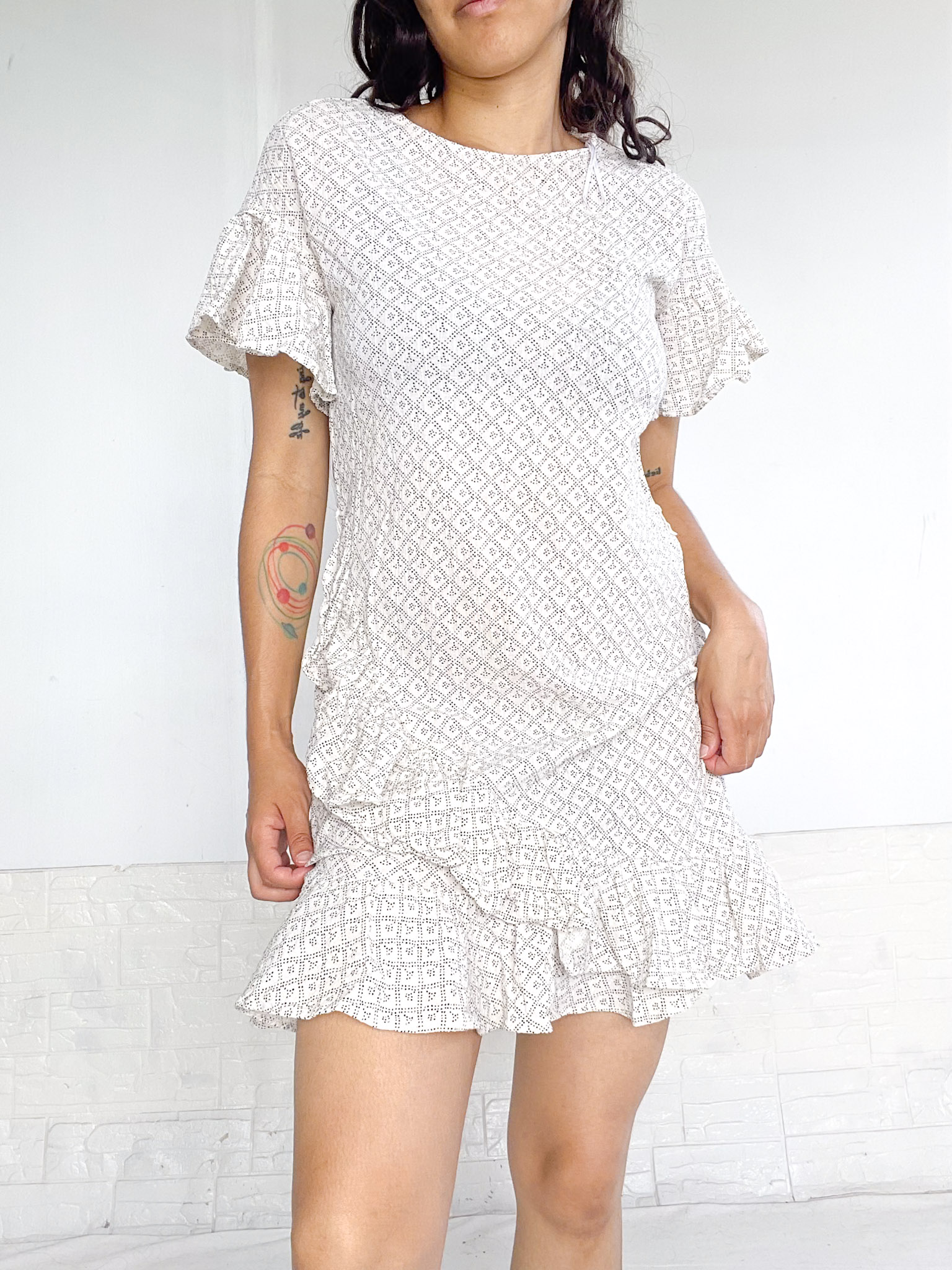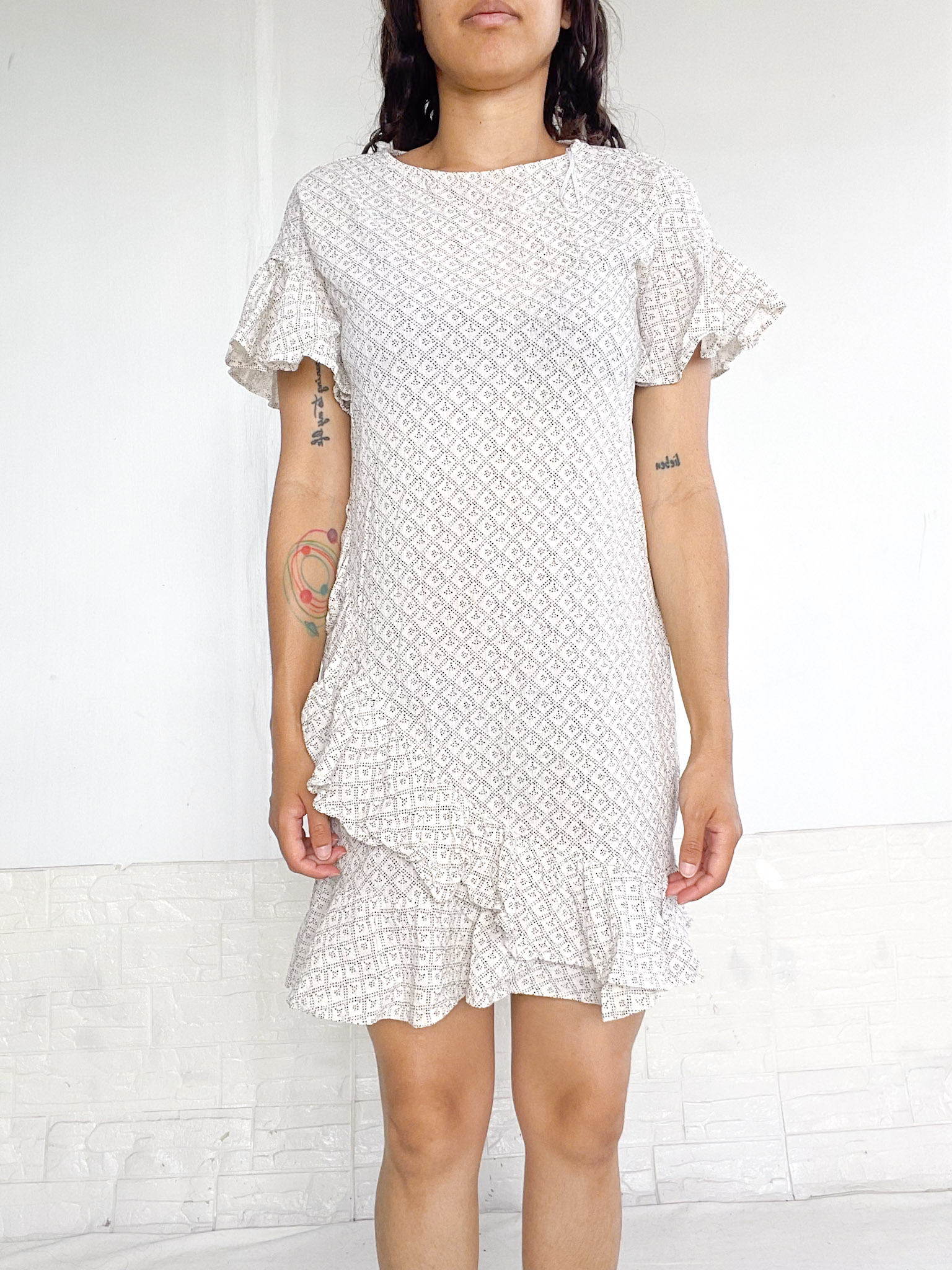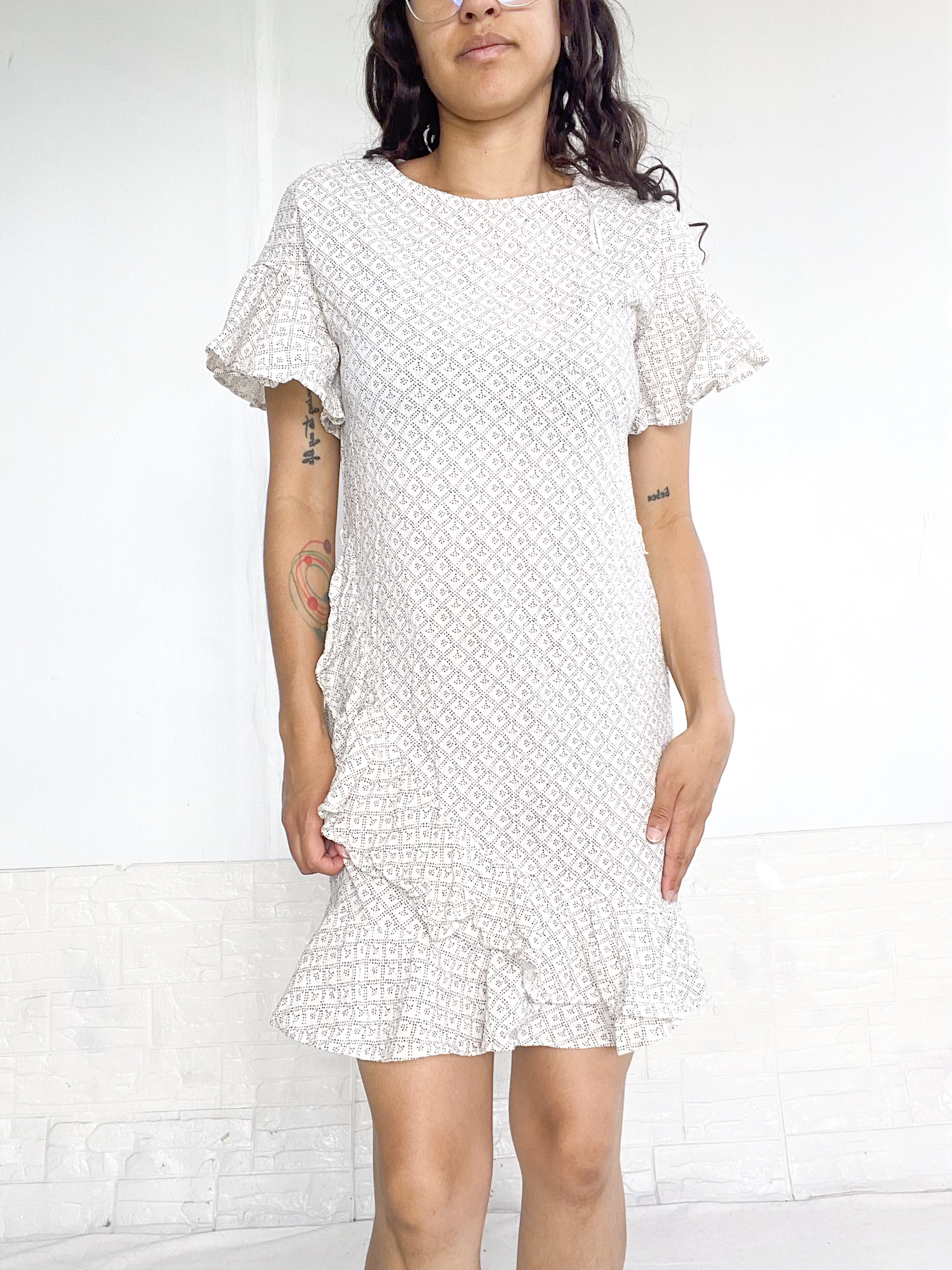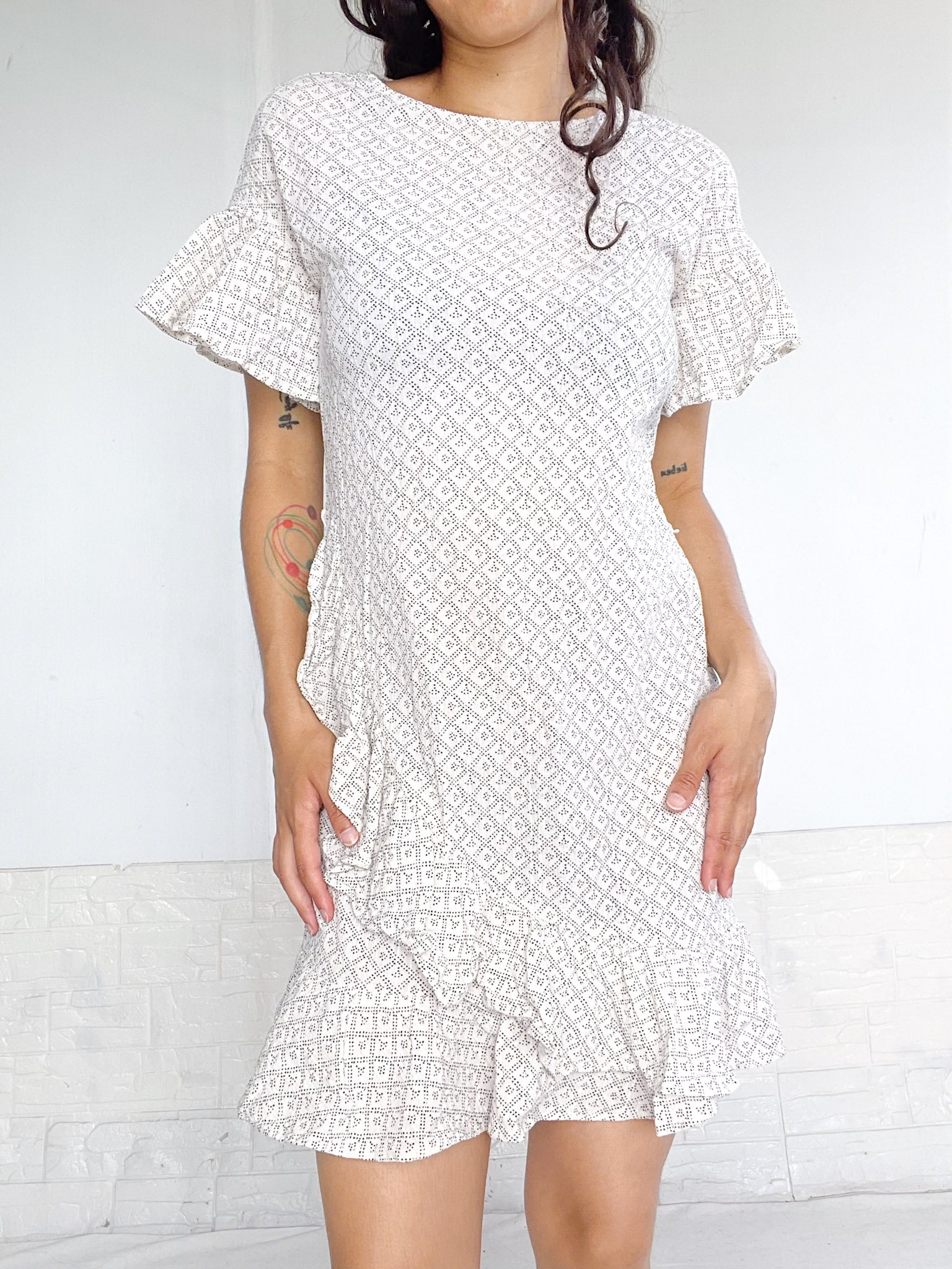 Vestido en color banco con detalles en negro, tiene volados en el bajo y en las mangas