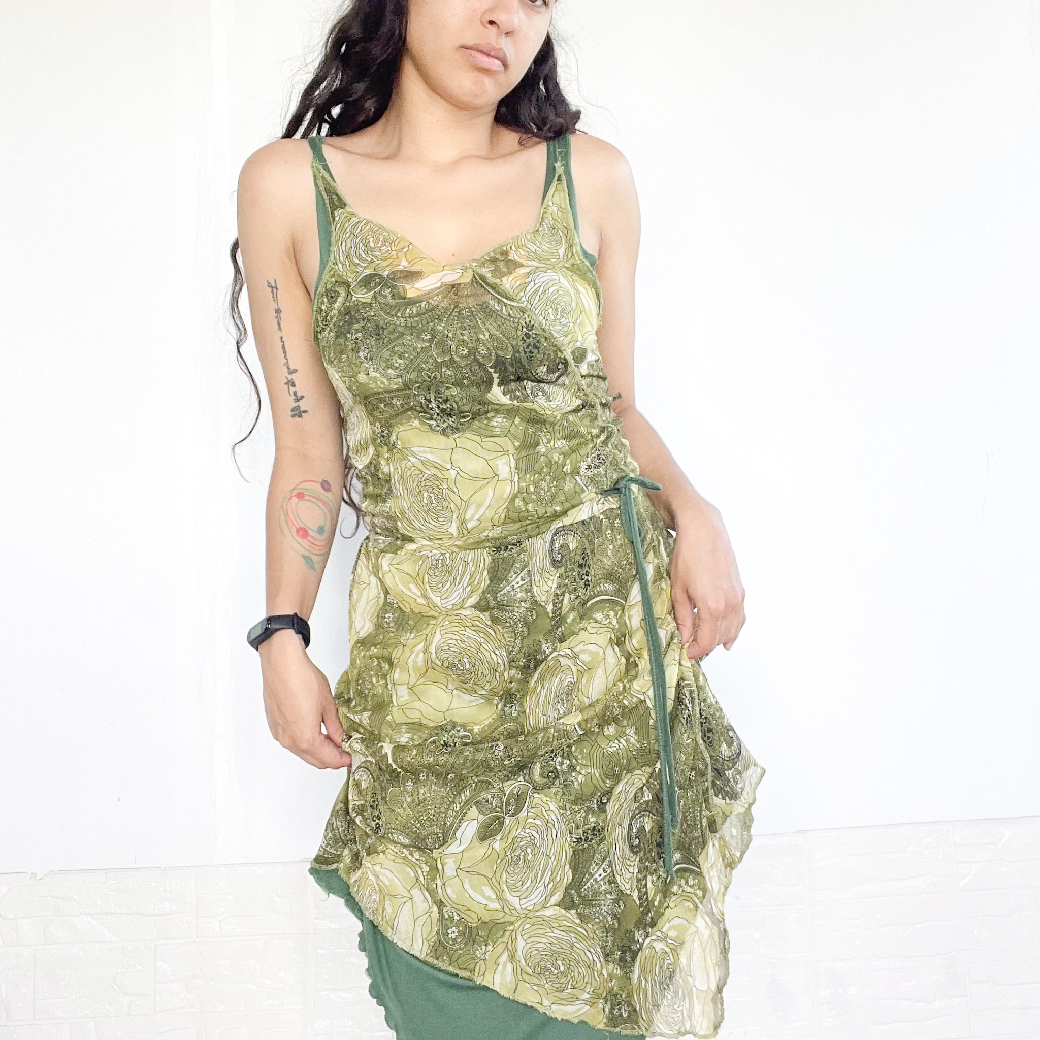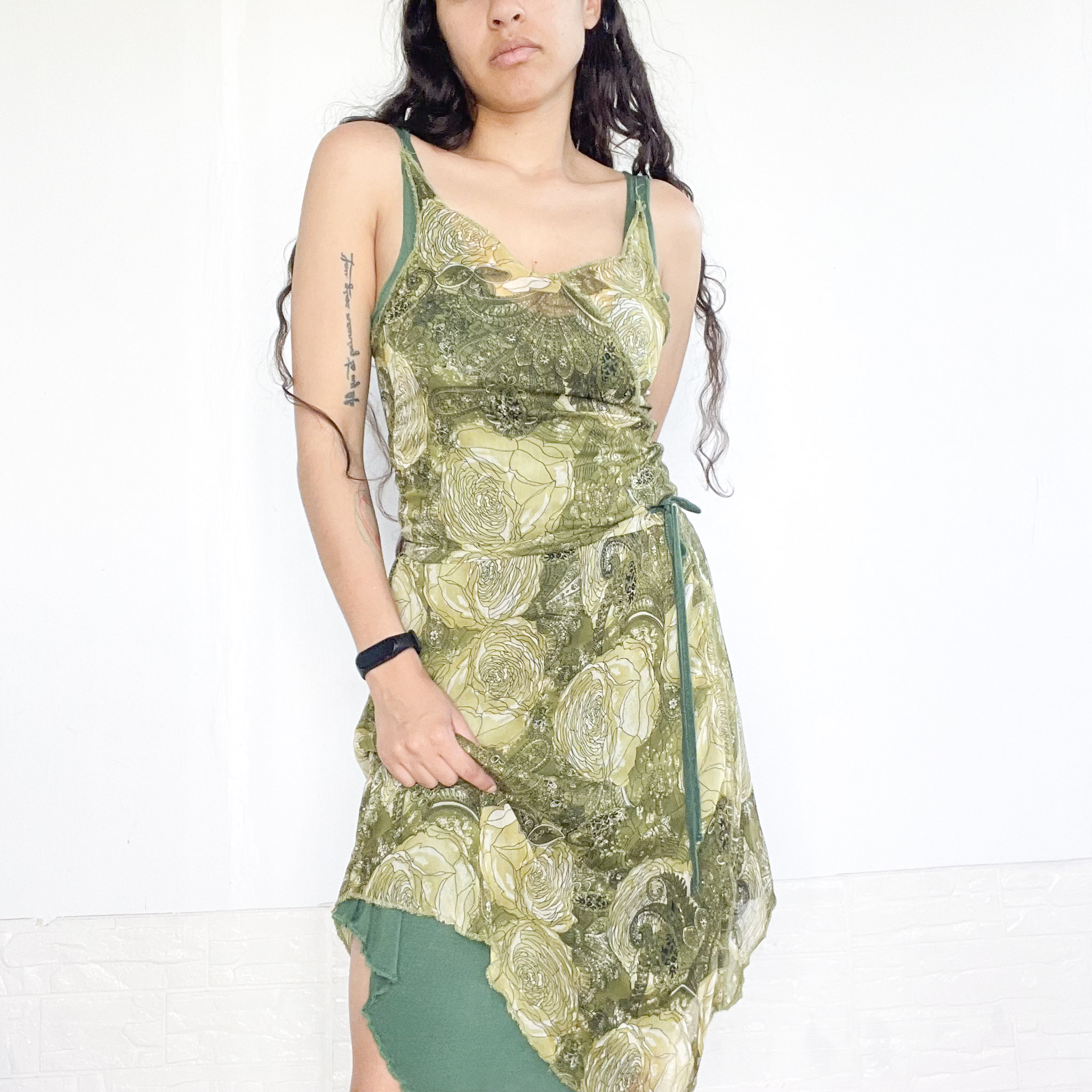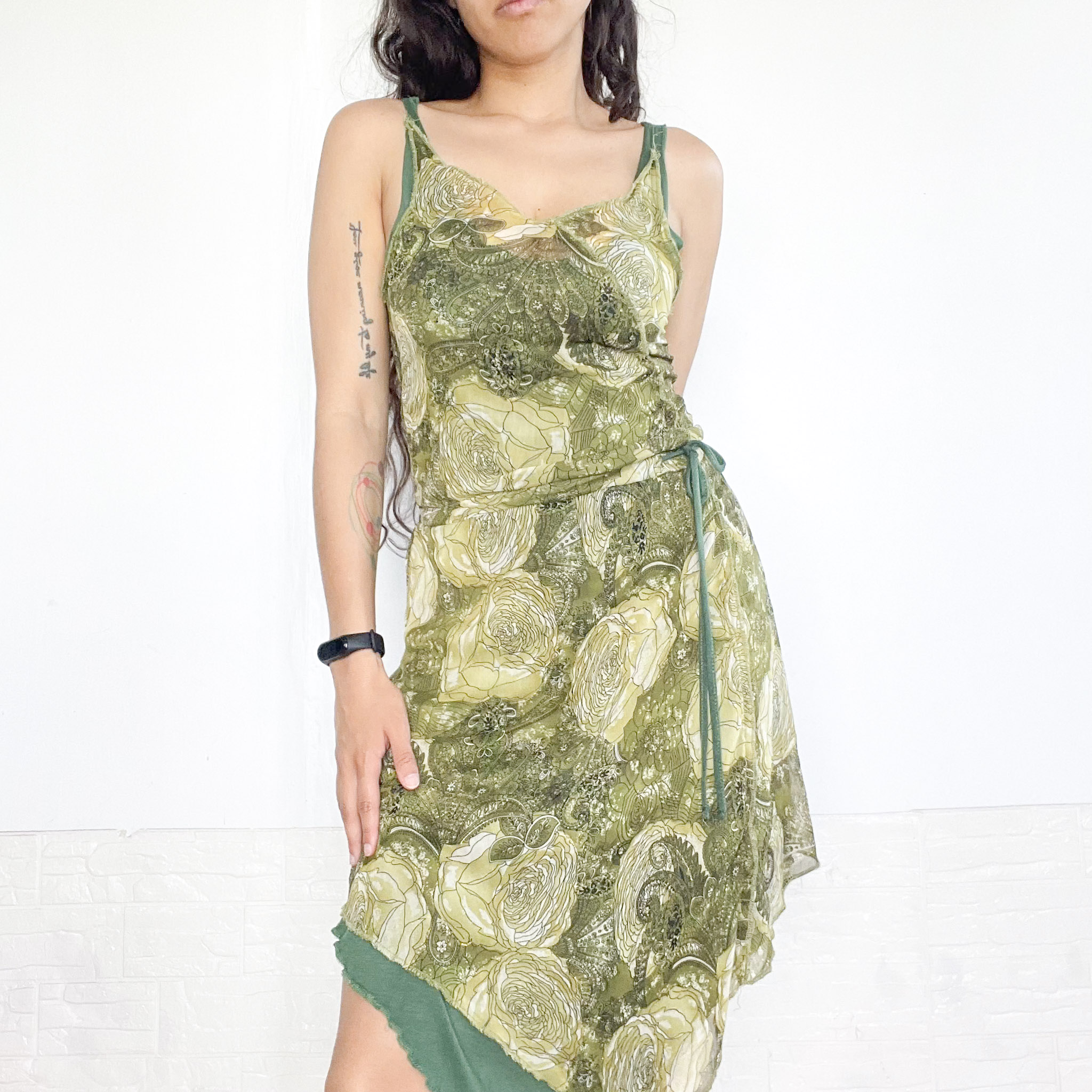 Vestido estampado en diferentes tonos de verde. Tiene lazos para amarrar en la cintura y el bajo es asimétrico